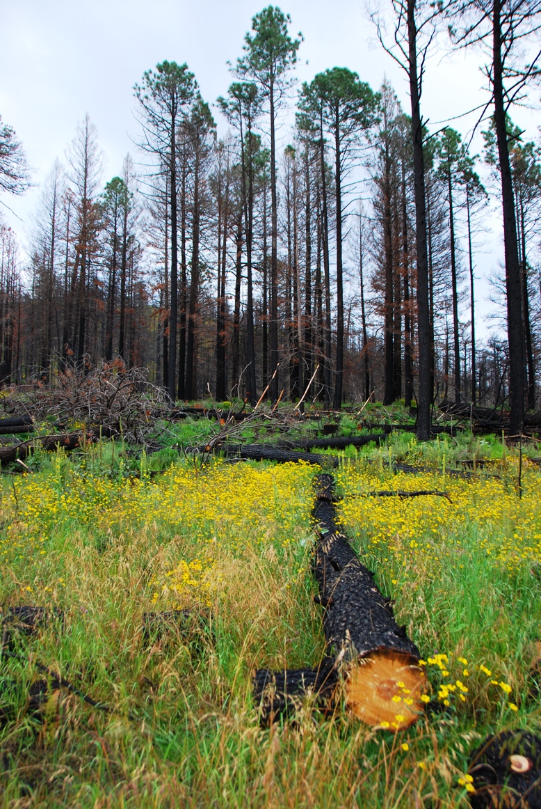 The location that I dreaded seeing, Rustler Park, also had some hopeful surprises. This area had clearly been severely burned, but far more trees than I had expected survived. With a more open understory there was also a breathtaking amount of beautiful flowers everywhere. Our survey route began at the closed campground and headed downhill along the road. This area was shockingly birdy. There are patches of large ponderosa pines that survived, some are singed on the edges but appear healthy. Not only did we find prized rarities of the range such as Mexican Chickadee, we had a roving flock of Red Cross-bills and mixed flocks of warblers, juncos and Chipping Sparrows.