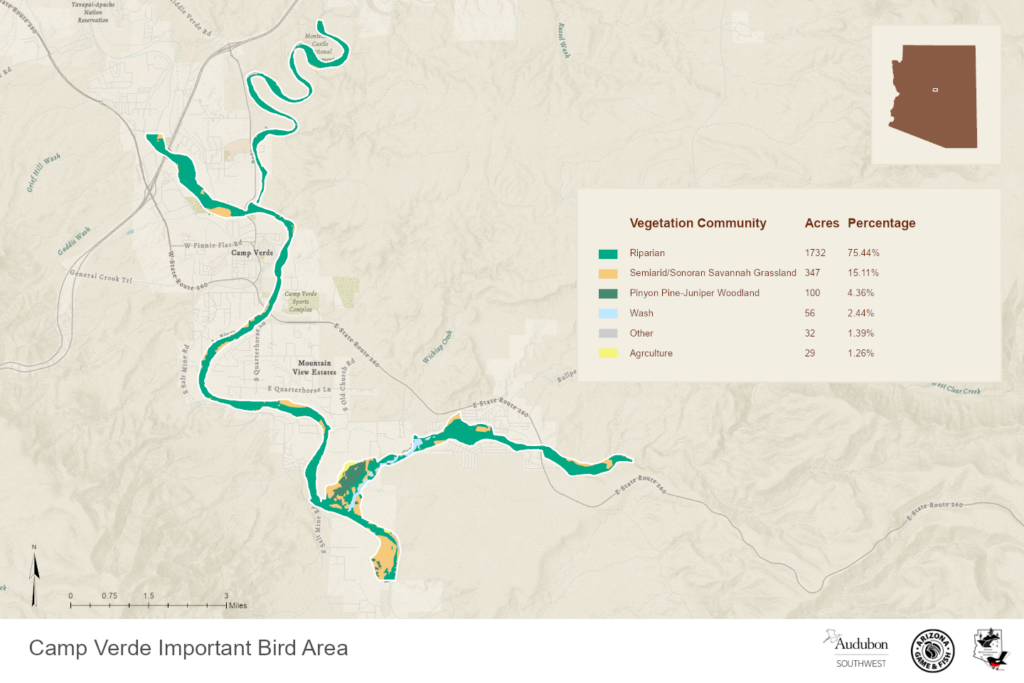 Site Description: The 17-mile stretch of the Verde River running through the boundaries of the Town of Camp Verde supports a variety of important woody riparian and wetland vegetation types that provide important habitat for resident and migratory birds, as well as a host of other wildlife species. The predominant habitat type within this IBA is riparian vegetation, comprised of Sonoran Deciduous Swamp and Riparian Scrub type vegetation, and Sonoran and Oasis Riparian Forest. Significant stretches of the Verde River through Camp Verde are healthy stands of Fremont Cottonwood-Goodding Willow gallery forests – one of the rarest forest type in North America. Within the IBA boundaries, there are significant areas of mesquite bosque woodland habitat of arid uplands sitting adjacent to the riparian habitat zone. These areas are characterized by open, park-like conditions, with an understory of grassy forbs. This vegetation type, while once common, has become increasingly rare due to development – either residential or agriculture – in the upland areas near perennial rivers and streams. It is an area favored by many threatened and endangered bird species, such as yellow-billed cuckoo and Bell’s vireo.