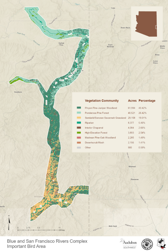 Site Description: This IBA area begins at the point of entry of the Blue River into Arizona (from its headwaters in New Mexico), which is east of Alpine, AZ. The site follows the Blue River to its confluence with the San Francisco River and includes the selected tributaries of the Campbell Blue River and KP Creek. The site also includes the San Francisco River from its entrance into Arizona, and ends near Clifton, AZ. The Blue River nomination area includes approximately 40 miles of the Blue River, ten miles of the Campbell Blue River, 5 miles of KP Creek, and over 20 miles of that portion of the San Francisco River under Forest Service jurisdiction in Arizona. This river system and approximately a 3/4 mile buffer on either side comprise this site. The remoteness and limited accessibility to this area may be an asset to long-term conservation of its riparian and associated habitats that are at risk from disappearing throughout Arizona and the Southwest.
