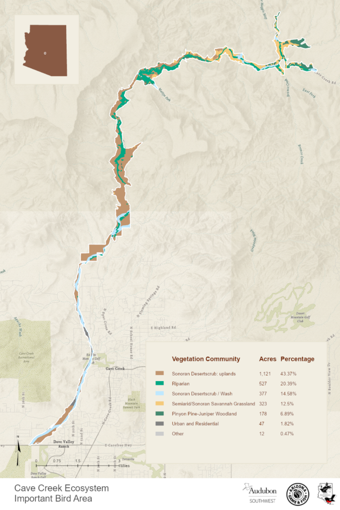 Site Description: Cave Creek Ecosystem IBA is located in the Sonoran Desert Eco-region, specifically the Arizona Upland subdivision of the Sonoran desert scrub biome. The IBA encompasses cottonwood/ willow/sycamore and mesquite bosque riparian areas along with associated desert scrub uplands. Flowing or standing water is present in many places and there is considerable elevation change and habitat diversity in this IBA. Much of the land is publicly owned and in a natural undisturbed state. It is an exceptional example of a lowland mesic and xeric southwestern riparian community with adjoining undisturbed high quality upland Sonoran desertscrub vegetation. The perennial water found in reaches of Cave Creek supports a healthy high quality cottonwood/willow and sycamore vegetation and ecological community.