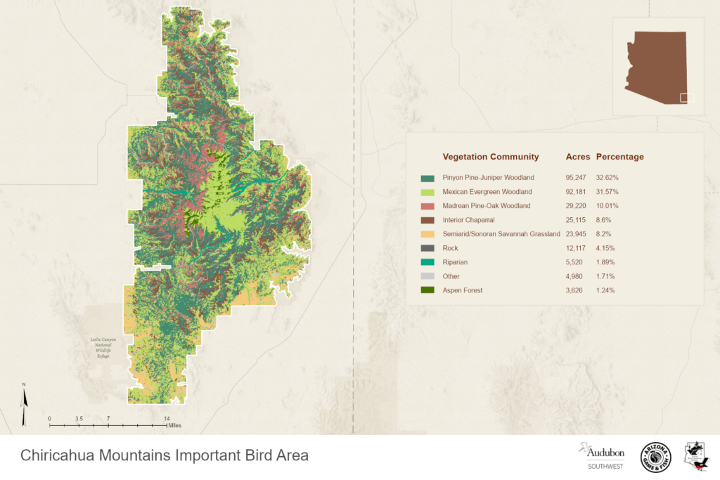 Site Description: This IBA encompasses the large “sky island” mountain range, the Chiricahua Mountains in southeastern Arizona almost 40 miles long by 20 miles wide. The IBA extends from 5000 feet elevation, at the ecotone between grassland and oak, to the top of Chiricahua Peak at 9795 feet. Sierra Madrean species reach the northernmost extension of their ranges within this IBA. This IBA is notable for the incredible diversity of bird, mammal, reptile and amphibian species that occur here due to the numerous life zones that overlap in this sky island.