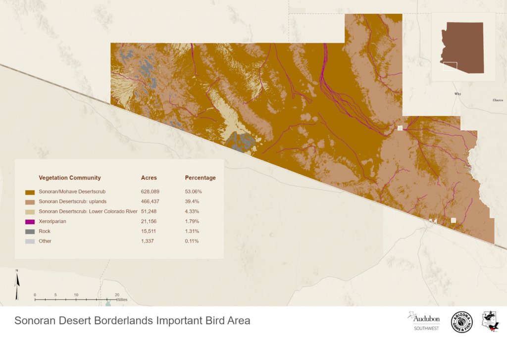 Organ Pipe NM: Organ Pipe Cactus National Monument is an excellent example of an Arizona Upland ecosystem within the Sonoran desertscrub biome. In early spring of 2009 and 2010, five canyons were surveyed by Audubon IBA bird survey transects: Alamo Canyon, Arch Canyon, Estes Canyon, and Victoria Mine Trail (VMT surveyed only in 2009). Audubon IBA surveys were restricted to the Ajo Range and a small section of the Sonoyta Mountains (by VMT), as there were park restrictions due to safety concerns preventing access to the Puerto Blanco Mountains, Bates Mountains, Cipriano Hills, and Quitobaquito Hills and Springs. These intensive Audubon surveys show this park to be important to at least five special conservation status species in Arizona. Additionally, our surveys found this park is most important for its outstanding xeric riparian and upland sonoran desert habitats supporting an exceptionally diverse avian community.