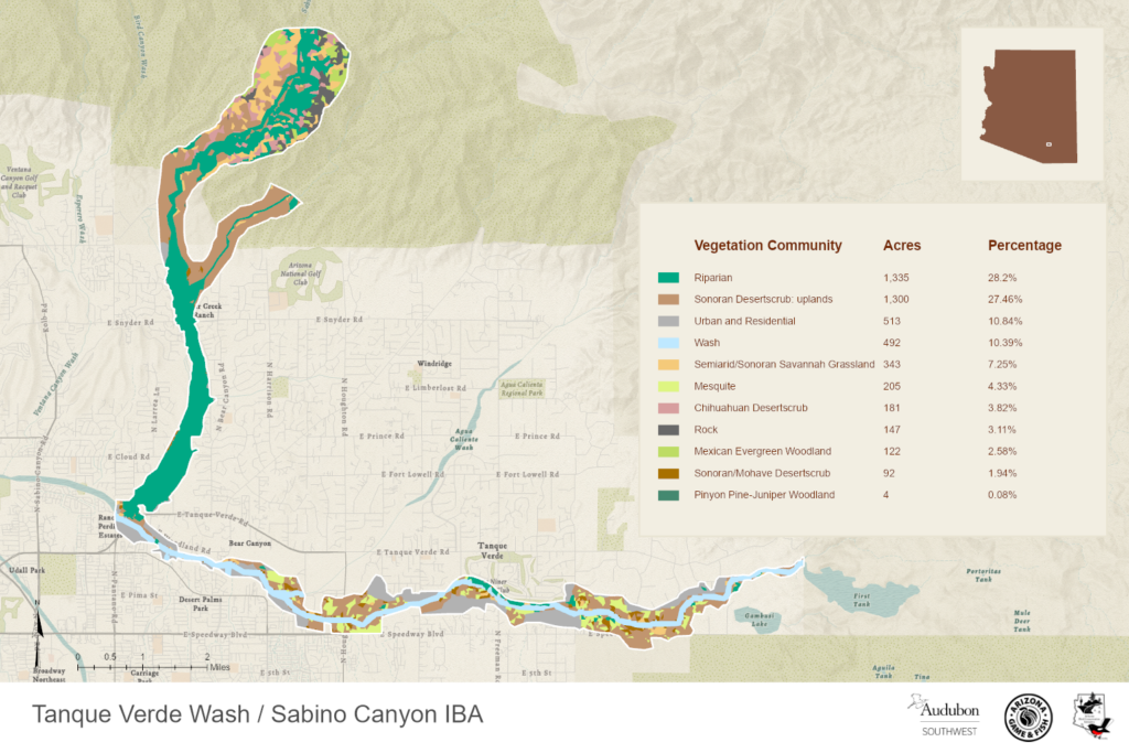 Tanque Verde Wash: The Tanque Verde Wash provides habitat for riparian breeding birds, migratory birds and wintering birds as well as acting as a corridor that allows movement of wildlife through ex-urban Tucson. Within 103 surveys (44 transects and 59 point counts) from January 2009 to May 2011 (surveys ongoing to present), the IBA survey teams found 131 species of birds in the Tanque Verde Wash. Of those, 20 are special conservation status species, which qualifies this site under the Arizona IBA criterion, Site Important to Special Status Avian Species.
