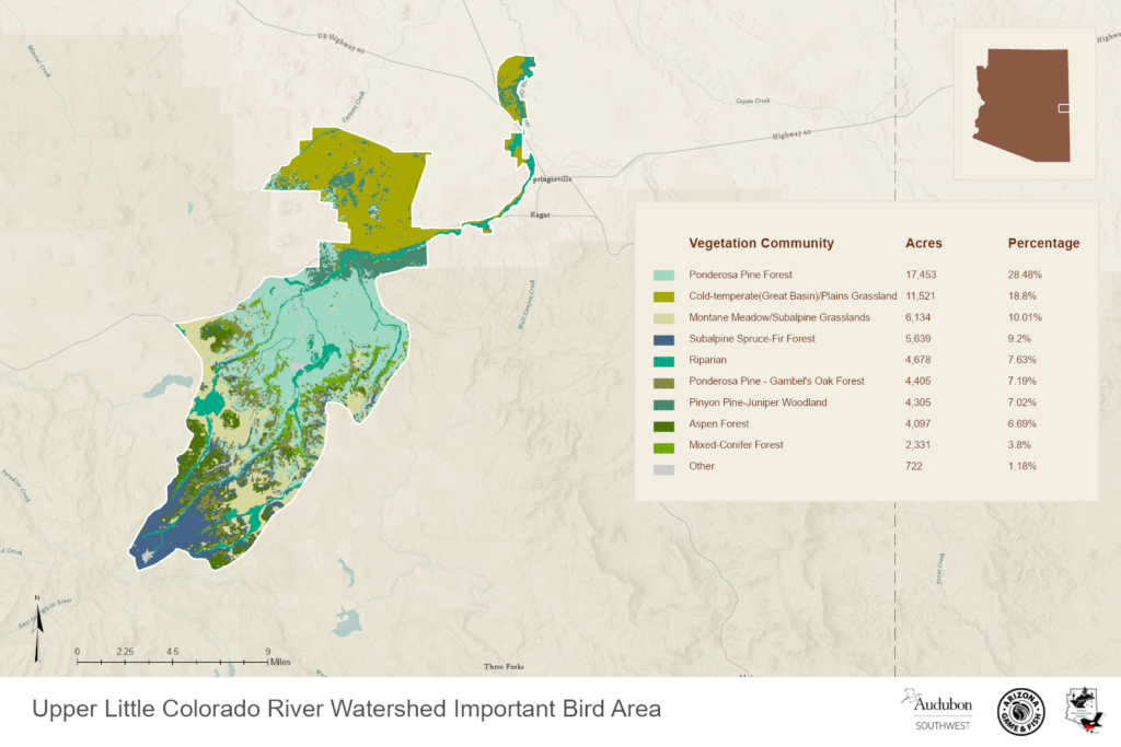 This IBA encompasses approximately 27 miles of the Little Colorado River (LCR) from its headwaters on Mount Baldy flowing northeast to the 355-acre Wenima Wildlife Area and includes the tributaries of Hall Creek, Benny Creek, Rosy Creek, Butler Canyon, the East Fork of the LCR, the West Fork of the LCR, and the South Fork of the LCR. The IBA is ¼ to ½ mile wide along the drainages, but encompasses some adjoining uplands where known Mexican Spotted Owl and Northern Goshawk territories exist. Several lakes/reservoirs are included in the watershed and are within the IBA: Lee Valley Reservoir, White Mountain Reservoir, River Reservoir, Tunnel Reservoir, Bunch Reservoir, and Becker Lake.