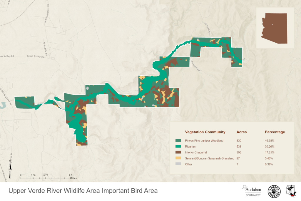 Site Description: The Upper Verde River Wildlife Area IBA, is located approximately eight miles north of Chino Valley in Yavapai County, Arizona. The IBA consists of 2145 acres located along the upper Verde River and lower Granite Creek. The primary management emphasis for the Upper Verde River property is to manage riparian habitat and maintain native fish diversity. Secondary management emphases are environmental education and compatible wildlife oriented recreation.